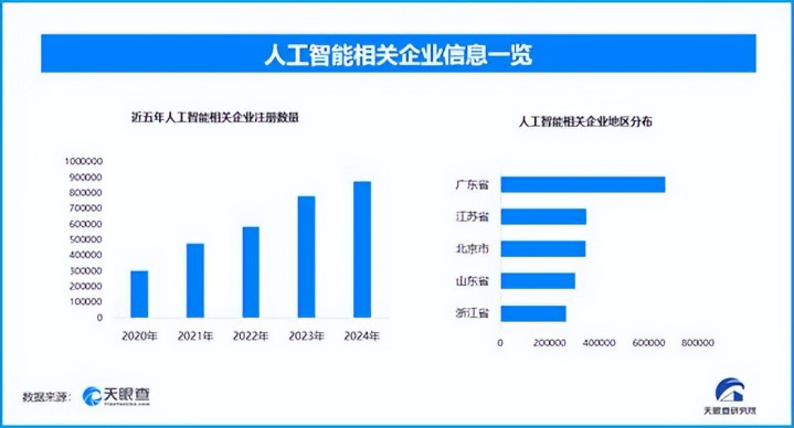 天眼查专业版数据显示,截至目前我国现存在业、存续状态的人工智能相关企业超442万家。其中,2025年截至目前新增注册相关企业约50.5万余家,从企业注册数量趋势来看,近五年间,人工智能相关企业的注册数量呈现出逐年增长的态势,并在2024年达到顶峰,为超87.4万余家。